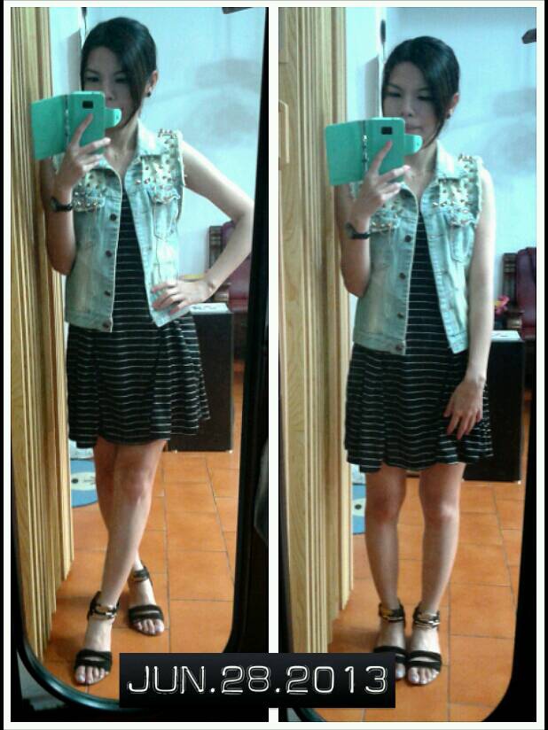 背心條紋小洋裝與鉚釘單寧背心
