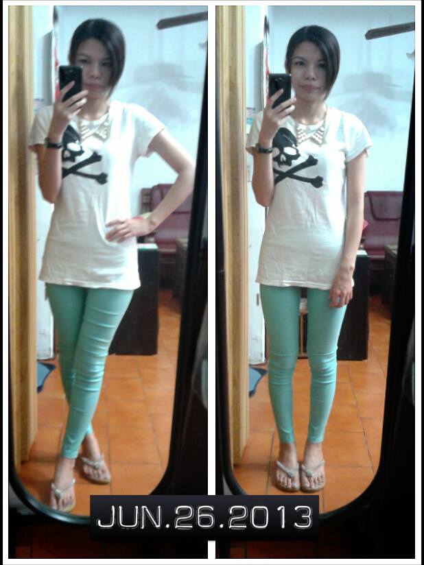 白色長版骷髏T與色褲