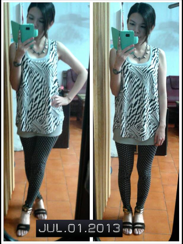 長版背心加上幾何罩衫背心與點點內搭褲