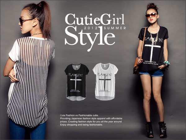 率真甜心~拼接設計印十字英文後接直條雪紡T(黑/白)180