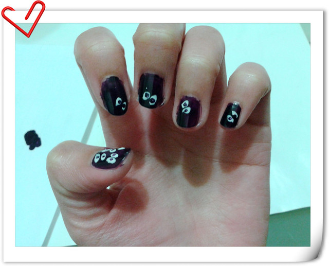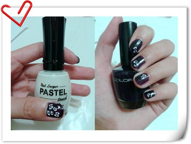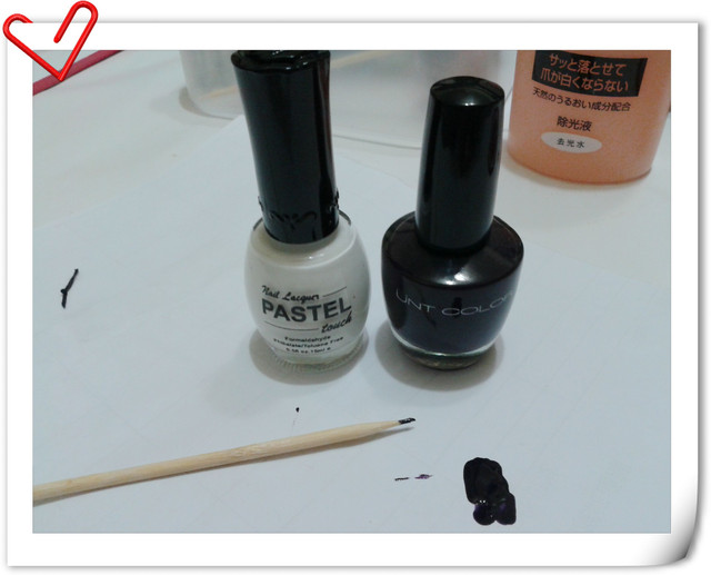 先打底再用白色指甲油畫兩點再用竹籤沾取深紫色指甲油點上