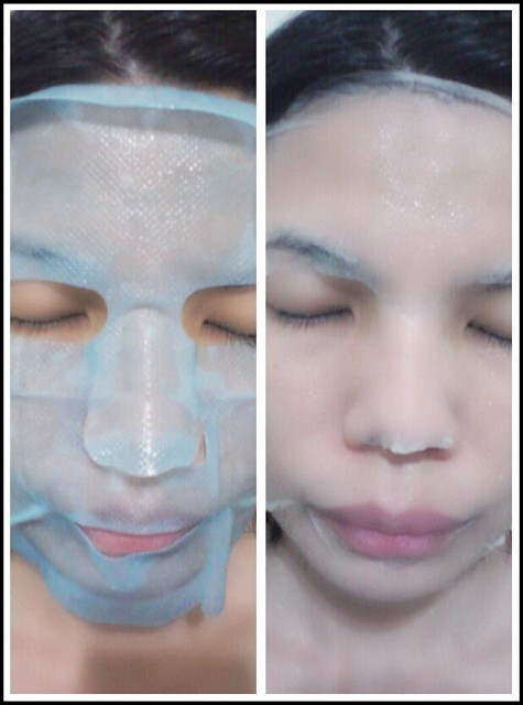拆開包裝面膜分為白色跟藍色兩面!先撕開白色那層再往臉上敷上